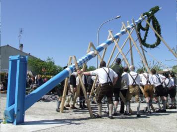 Am 1. Mai wurde dann der Maibaum bei herrlichem Wetter und einem weißblauen Himmel in einem Umzug vom städtischen Bauhof quer durch die ganze Stadt zur „Rue de Wolfratshausen“ gefahren. Angeführt von der Musikkapelle folgte der von den zwei traditionell geschmückten Kaltblütern gezogene Baum sowie die Maiburschen und Maimadeln. Fast zwei Stunden waren dann nötig, um den Maibaum auf traditionelle bayrische Art mit Scherstangen aufzustellen. Nachdem sich danach die Burschen mit Brotzeit und dem mitgebrachten Bier gestärkt hatten, folgten die Ansprachen der beiden Bürgermeister René Vignerie und Helmut Forster und unserem Vereinsvorsitzenden Achim Weber und schließlich das Aufziehen der bayrischen Fahne begleitet von der Bayernhymne sowie der traditionelle Maitanz.